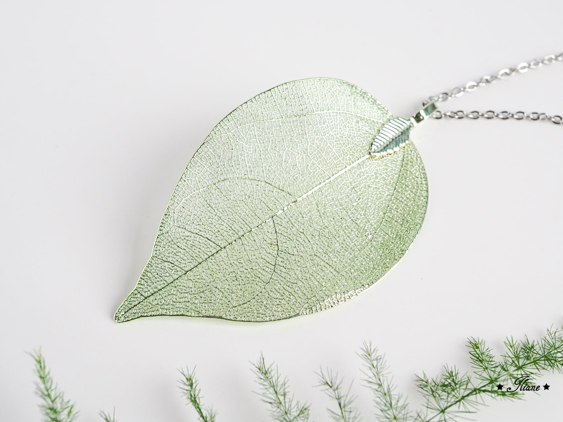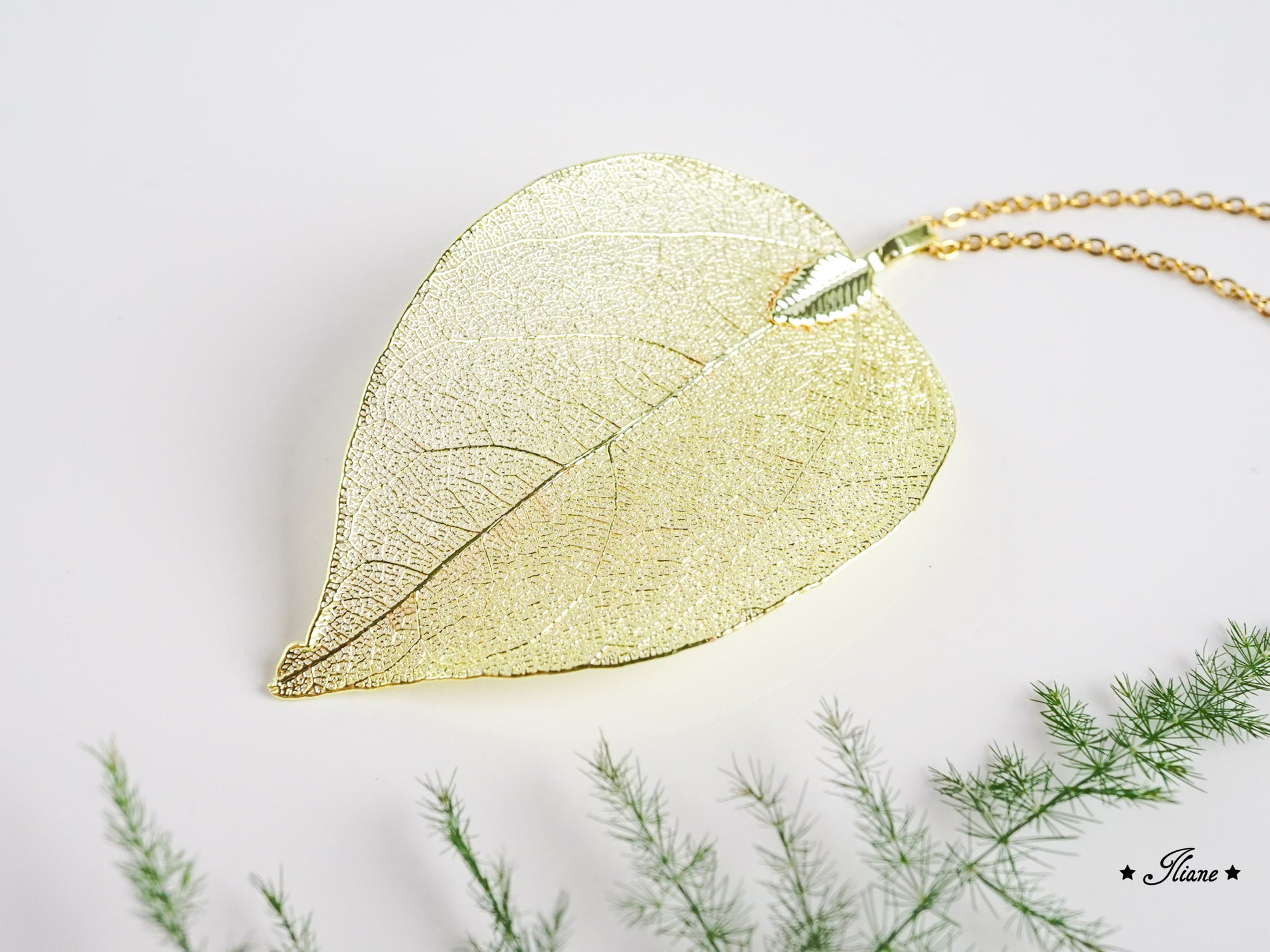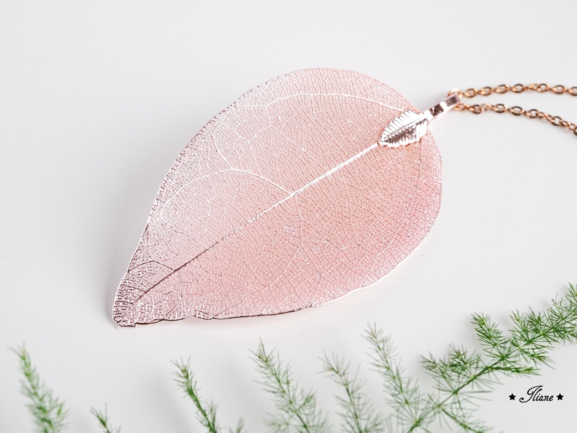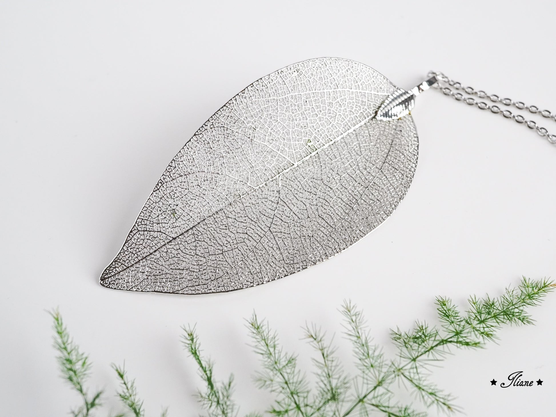 Der Anhänger besteht aus einem echten Blattskelett, das mit einer feinen Schicht Metall überzogen wurde. So bleibt die filigrane Struktur des Blattes erhalten und wird gleichzeitig zu einem glänzenden, beständigen Schmuckstück veredelt.
