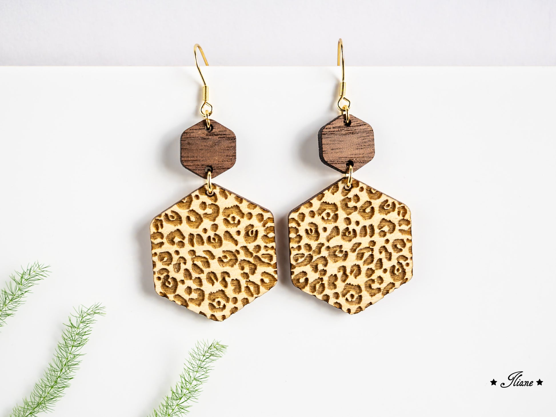 Handgefertigte Ohrringe aus Nussbaum- & Ahornholz mit trendigem Leo-Muster